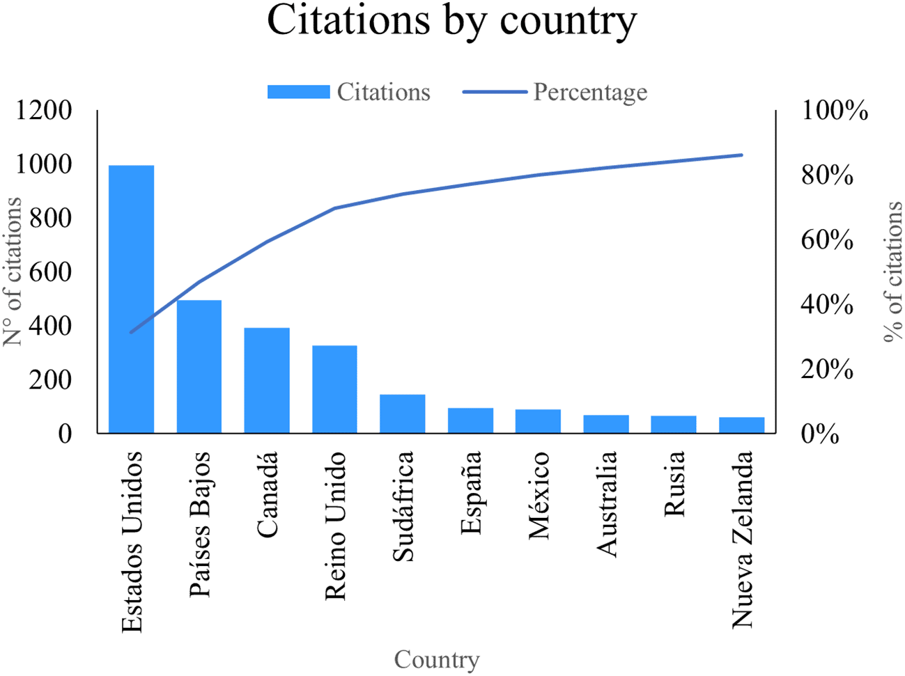 It is important to consider that the number of citations may be influenced by external factors, such as the greater visibility and reach of journals in which these studies are published, as well as the concentration of active researchers on the topic in certain countries. Therefore, the considerable number of citations in these countries may be indicative of an elevated level of research activity and topic relevance in specific contexts, rather than a universal phenomenon across all countries.