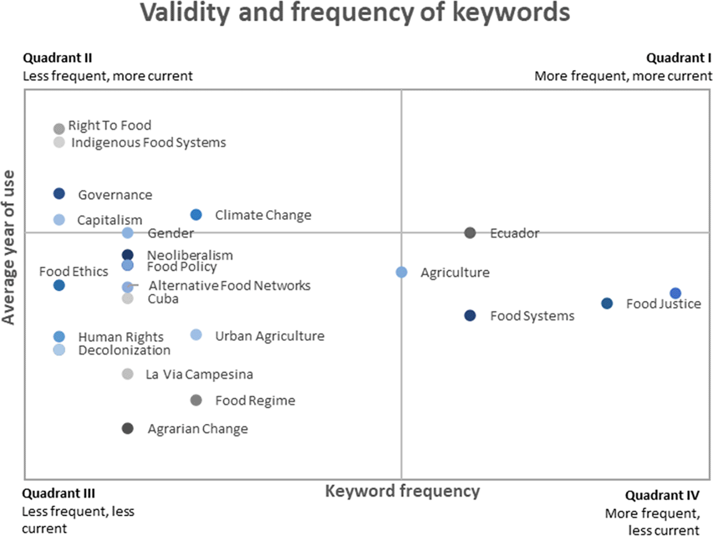 The present bibliometric analysis has enabled the identification of the positioning of the main keywords used by the authors as descriptors of their research, as shown in a Cartesian plane. The horizontal axis, or X-axis, relates to the frequency of use of each concept, that is, the number of times it has been used. In contrast, the vertical axis, or Y-axis, positions the average years of use of such concepts. Figure 7 illustrates quadrant IV, which encompasses the most frequently occurring concepts, yet whose average use is not current. These include terms such as “Agriculture” and “Food systems,” which pertain to the promotion of a transition towards agri-food alternatives developed around broader social, environmental, and ethical principles.46 Similarly, the term “food justice” is situated within the same quadrant. This term emphasizes the structural inequalities that shape the socio-spatial organization of food systems, creating forms of privilege and disadvantage in the intersectionality of class, gender, race, and other forms of differences.47,48