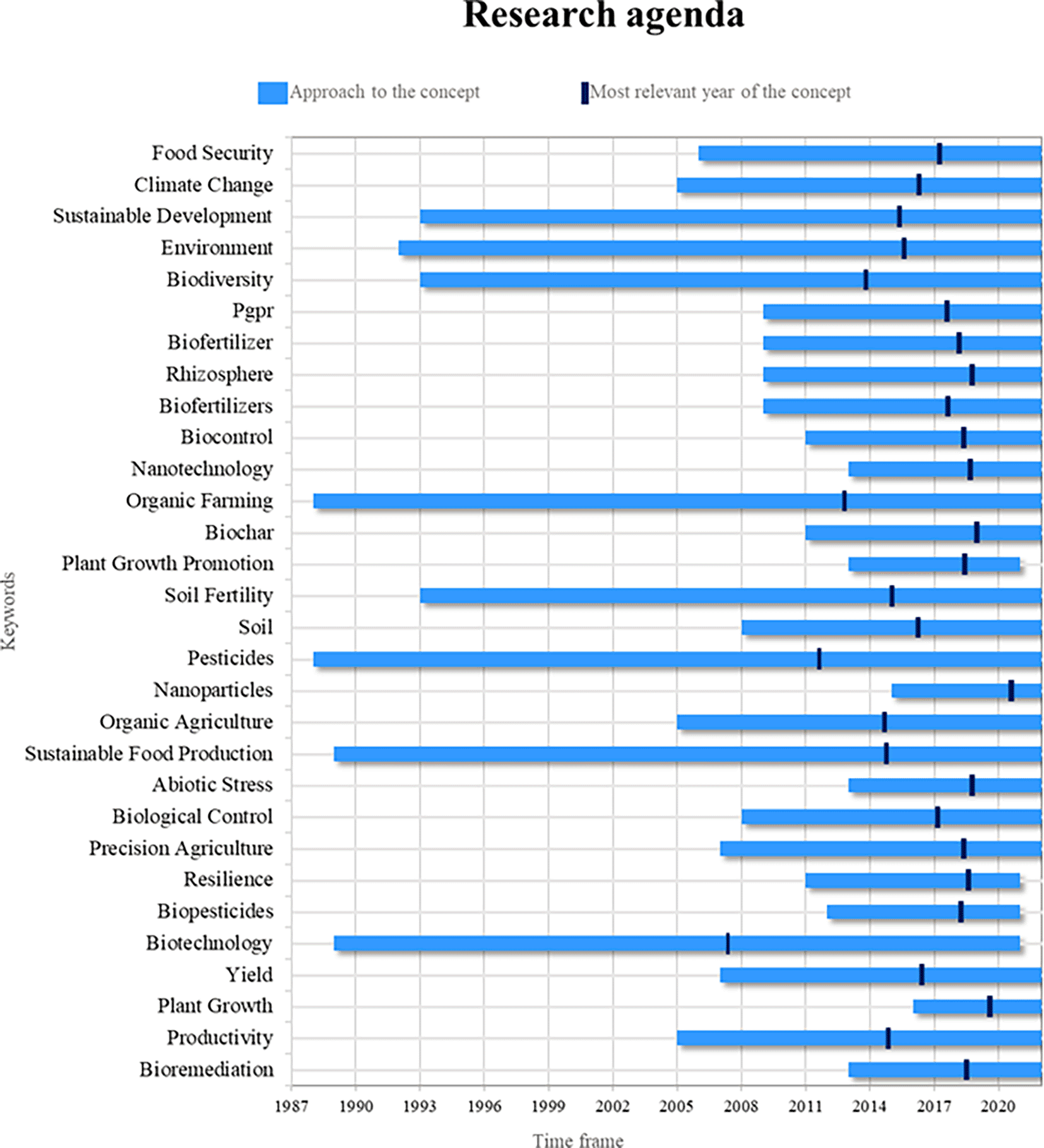 In this regard, the initial set of prominent concepts for future studies encompasses those that have been addressed over an extended period, thereby indicating their significance within the current and future scientific discourse. The initial concept is that of sustainable development, which is of paramount importance in addressing the current challenges related to food sovereignty. Future research should concentrate on the evaluation and distribution of food, as well as the implementation of rigorous studies on the impact of sustainable agricultural practices.