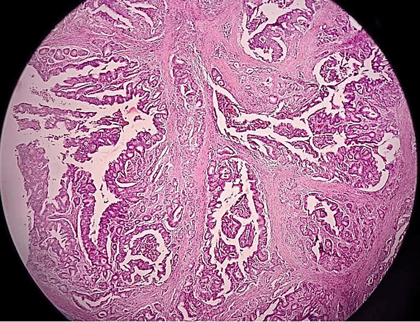 The patient was scheduled for a cystoscopy and urethral mass excision two days later. Cystoscope was inserted through the cystostomy access, showing a tumor infiltration to the anterior wall of the bladder approximately 2 cm from the bladder neck ( Figure 3). Due to highly suspicious lesions of malignancy based on visual, endoscopic, and imaging appearance, we didn’t perform preoperative biopsy and proceeded to definitive surgery. Radical urethrectomy and partial cystectomy were then performed through a transurethral approach with antegrade cystoscopy guidance. This method was used to make sure the tumor completely resected since we do not have frozen section facilities in our hospital. The excision was extended to the bladder neck and a portion of the anterior segment of the bladder wall which infiltrated by the tumor. We decided to do the bladder preservation and bladder neck reconstruction using remaining anterior bladder wall with the intention to facilitate voiding through the orthotopic site with a Foley catheter, thereby avoiding the need for a permanent suprapubic diversion. The tumor-free bladder punctum was pulled through the former urethral orifice and the bladder muscle was sutured to the urogenital diaphragm using 3-0 Vicryl, interrupted in eight directions ( Figure 4). The bladder mucosa is sutured to the vulvar mucosa, similar to a vesicostoma with 5-0 Chromic, interrupted in eight directions. After the suturing was done, we re-evaluate the bladder with cystoscopy to make sure the ureteral orifices remain intravesical. The surgery was performed without complications and the patient was discharged home within 5 days using silicone foley catheter. The silicone catheter is left in place for 1 month to assure good healing and avoid stenosis. The pathology report revealed 5×4 cm sized pT4 urethral adenocarcinoma with bladder infiltration, clear surgical margins, and enteric type histologic subtype ( Figure 5). Neither radiation nor chemotherapy were administered since the patient has negative node and no distant metastasis. At 1 month follow-up, the patient was in continuous incontinence status. This condition is expected since the sphincter was also resected during the surgery as the tumor already infiltrated the anterior bladder. But with the use of silicone catheter, we can avoid any leak and patient still can void timely through regularly clamp catheter. We didn’t performed uroflowmetry and PVR evaluation since the patient is incontinent without foley catheter. We aimed to maintain the catheter for long term usage to increase the patient quality of life. At the 1-year follow-up, the patient reported satisfaction with the outcome of the surgery and her quality of life. The CT scan evaluation showed no signs of recurrence or metastasis.