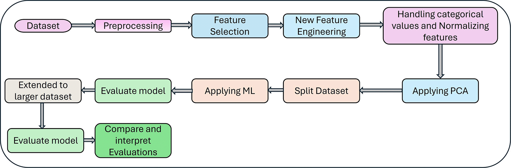 Here, the details of the dataset used, the new features engineered, the features dropped, and the detection algorithm used are described. In Figure 1, the steps used in this study, including feature selection, feature engineering, splitting the dataset, and the rest of the steps, are summarized.