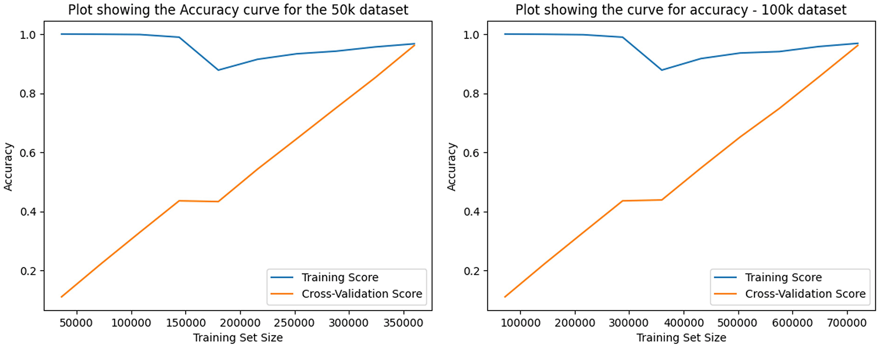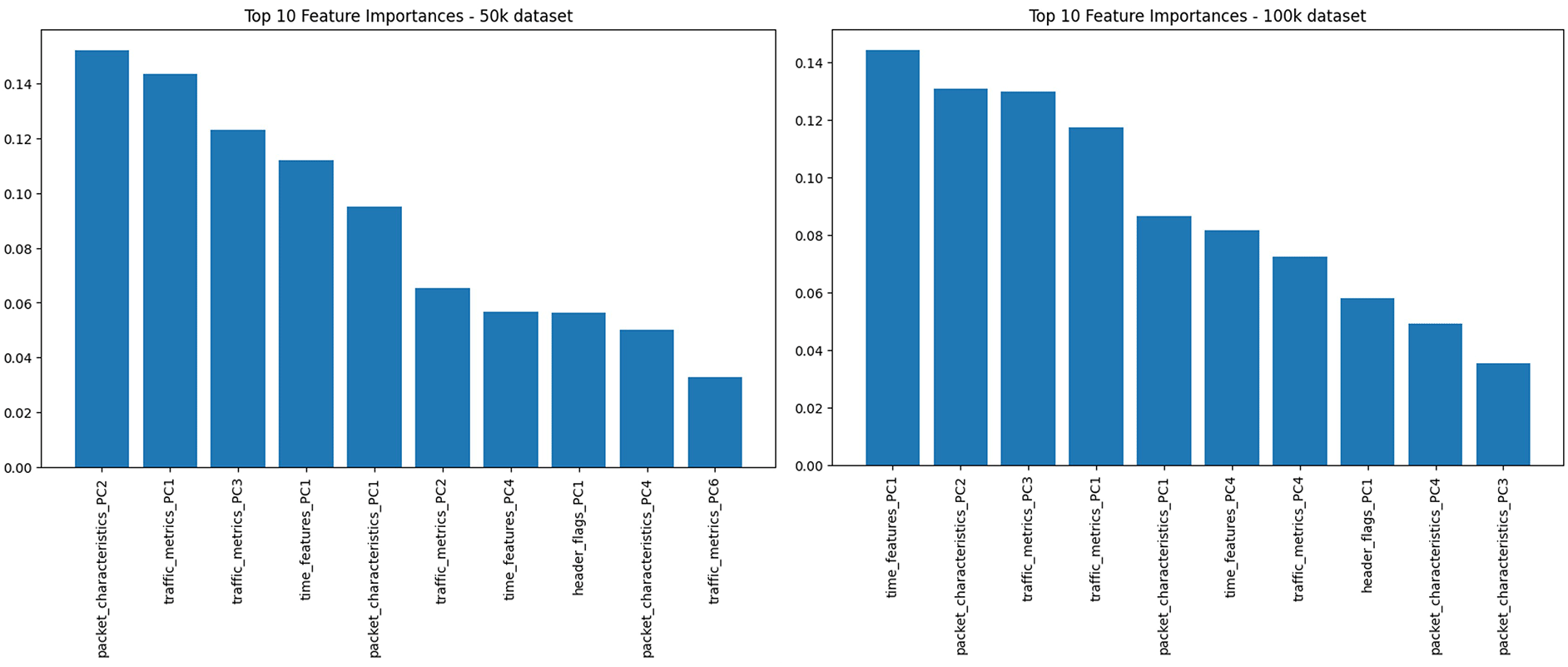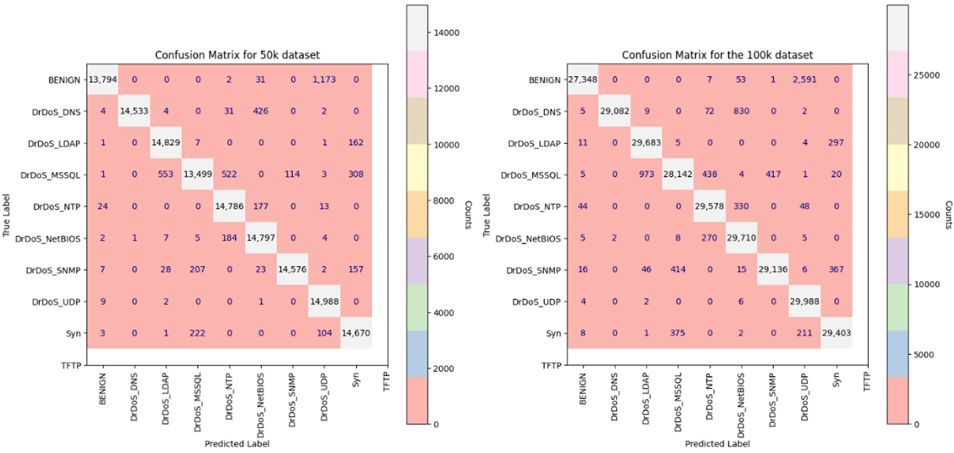 In machine learning models, performance against multi-class target sets is an essential feature, depending on the field of interest.27,28 In areas such as DDoS detection, the capability of the model plays a major role in real-world scenarios. Our model achieved the highest possible accuracy in classifying the various classes within the target column, and this could primarily be a result of the retention of importance within the dataset, although the dimensions were reduced categorically using PCA. This capability is evident from the distribution observed within the confusion matrix, where the false positives are minimal compared to the large size of the datasets used in this study. The confusion matrix for both the datasets (50k and 100k) is shown in Figure 2. This novel concept of categorized PCA successfully retained the importance of the dataset values. The stratified train-test split handled the bias in the evaluation and ensured the class proportions within the training and testing datasets, mirroring the distribution in the original dataset ( Table 3).