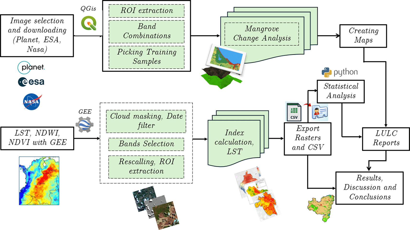 For the analysis of land use and land cover, Sentinel images from the Dynamic World platform, which manages a global scale with a resolution of 10 m (https://dynamicworld.app/), were accessed. To evaluate mangrove dynamics and their evolution, data from the Global Mangrove Watch (GMW) (https://www.eorc.jaxa.jp/ALOS/en/dataset/gm_e.htm), developed in collaboration with the Japan Aerospace Exploration Agency (JAXA) and Aberystwyth University, were used, which provided accurate estimates of the extent and changes in mangrove forests at 11 annual epochs between 1996 and 2020 (https://www.globalmangrovewatch.org/). In addition, NASA Landsat SEDAC Global Mangrove Forest Distribution data at 30-meter resolution were used to provide a detailed analysis of spatial and temporal patterns of mangrove cover. Data were obtained from the European Union’s Global Surface Water Explorer platform (https://global-surface-water.appspot.com/). Figure 1 illustrates the methodology used for the acquisition and processing of the satellite images used in this study.