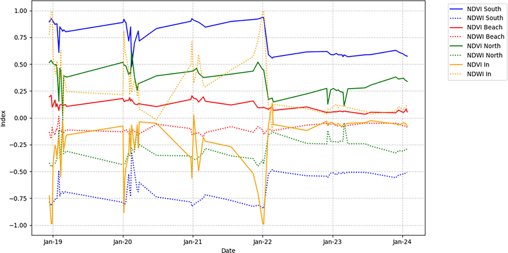 Figure 4 presents the NDVI variation in the four zones of the La Caimanera marsh from January 2019 to January 2024, highlighting the patterns in vegetation cover. The NDVI_south (blue) shows high and stable values, reflecting dense and consistent vegetation. In contrast, NDVI_Beach (red) shows low and fluctuating values, indicating sparse vegetation, because it is a construction zone, roads, little vegetation, and high salinity. NDVI_North (green) exhibits moderate vegetation, with significant mangrove density, lower than that of the southern zone, with seasonal variations or human influences. NDVI_In (orange) shows high variability but with a tendency toward negative values because the zone is mostly unvegetated. In parallel, NDWI in Figure 4 (dotted lines) shows the humidity in each zone. The southern region (blue line) presents high negative values because the high density of mangroves prevents the detection of water by the satellite. The beach (red line) fluctuates near zero, indicating the low humidity levels characteristic of this zone. In the north (green line), the predominantly negative values throughout the period reflect moderate humidity. In contrast, the interior zone of the marsh (orange line) shows high peaks associated with the presence of open water during most of the year.
