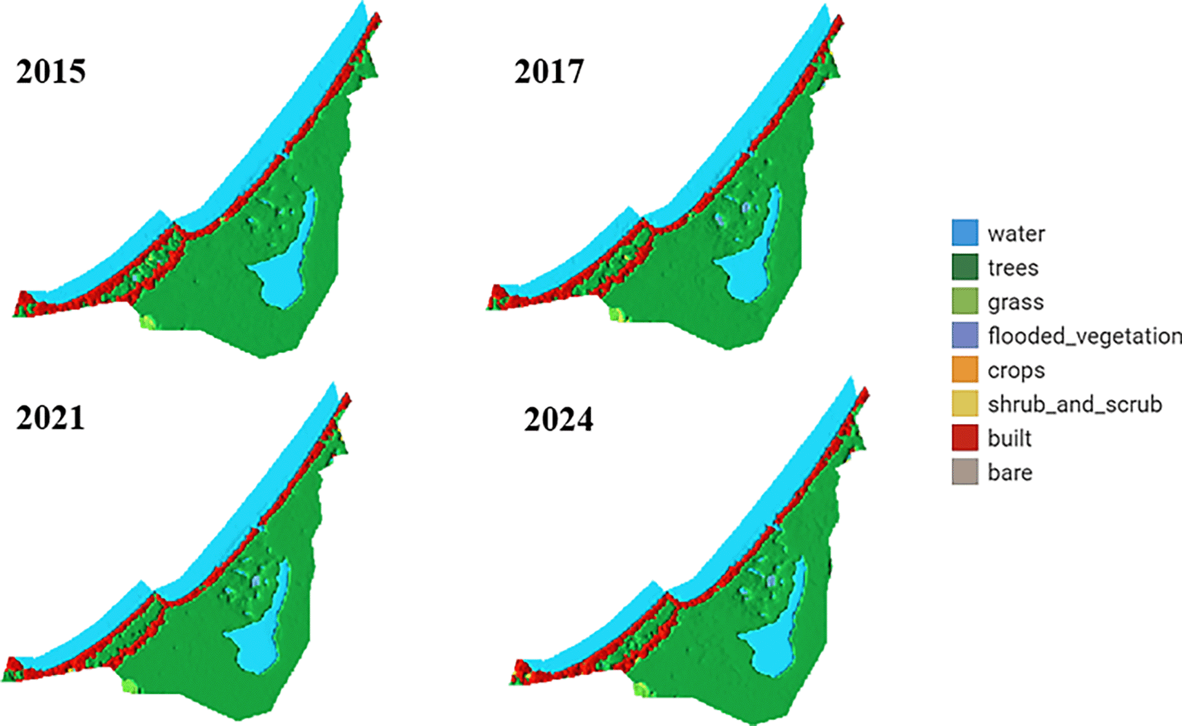 The analysis of LULC images of the La Caimanera marsh, performed from images captured by the Dynamics World platform during the summers of 2015, 2017, 2021, and 2024, revealed remarkable ecosystem resilience. Mangrove cover, predominant in the ROI, showed a slight expansion between 2015 and 2017 and remained stable in the following years, suggesting effective conservation management. In parallel, a subtle initial reduction in the marsh water body was observed, followed by stabilization, possibly attributable to climatic variations or adjustments in local water management. Urban dynamics in the coastal zone exhibited a pattern of controlled growth, as evidenced by a modest expansion of built-up areas between 2015 and 2017, which subsequently stabilized. This phenomenon, together with the absence of predominant agricultural areas, indicates a balance between human development and preservation of the natural ecosystem. Minor fluctuations in grass and shrub cover suggest a dynamic interaction between the natural processes of ecological succession and anthropogenic changes in land-use. Together, these patterns point to integrated and sustainable management of the coastal landscape, where mangrove conservation and urban growth regulation coexist harmoniously, promoting ecosystem resilience in the face of environmental and anthropogenic pressures. The La Caimanera marsh ecosystem shows remarkable stability over the period 2015-2024 with subtle but significant changes in the distribution of its main landscape components, as can be seen in the distribution of the territory in the La Caimanera marsh for 2015, 2017, 2021, and 2024, as illustrated in Figure 7.