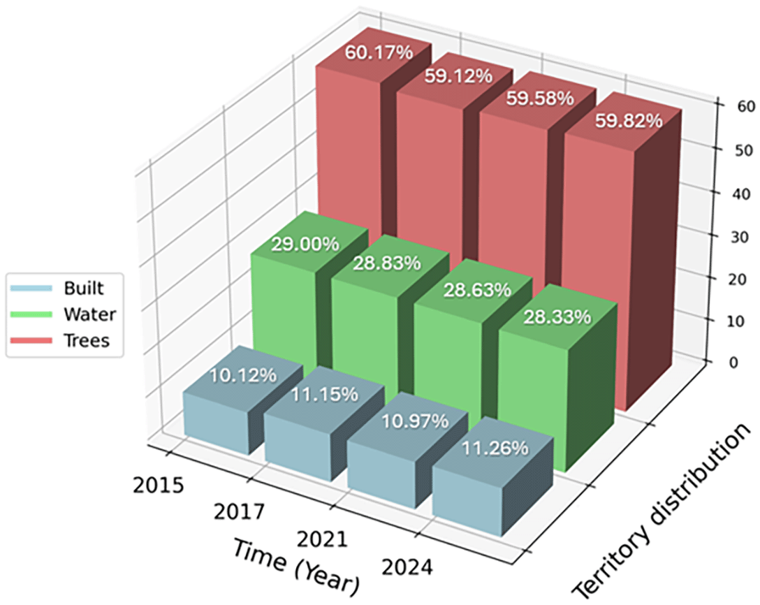 Tree cover, predominantly composed of mangroves, has experienced a slight decrease from 60.17% in 2015 to 59.82% in 2024, reflecting a marginal but persistent loss of vegetation. In parallel, the area covered by water showed a similar trend, decreasing from 29% in 2015 to 28.33% in 2024, corroborating the visual observation of a subtle contraction of the marsh water body. In contrast, built-up areas exhibit a gradual increase, rising from 10.12% in 2015 to 11.26% in 2024. This 1.143% increase in built-up areas, although moderate, indicates increasing pressure from human development in the natural ecosystem. The relative stabilization of these percentages between 2021 and 2024 suggests that land management policies may be effective in balancing development demands with conservation imperatives. These quantitative data reinforce the initial interpretation of a resilient ecosystem under careful management, where gradual changes in land cover reflect a delicate balance between mangrove conservation, marsh-water dynamics, and controlled urban growth. The persistence of a high proportion of tree and aquatic cover, despite developmental pressures, underscores the importance and effectiveness of conservation strategies implemented in the region.