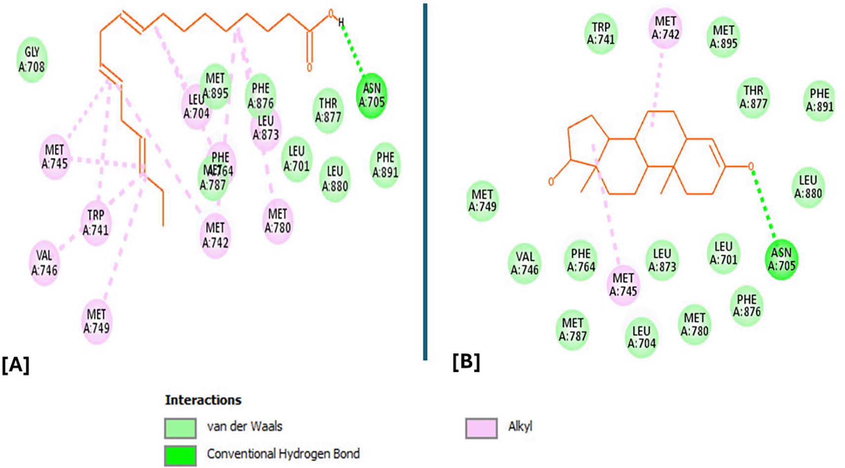 A= ligand (9,12,15-Octadecatrienoic acid), B= ligand (Testosterone).