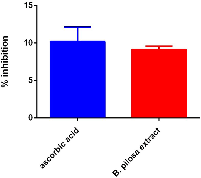 This analysis compares the antioxidant activity of the ethyl acetate fraction of B. pilosa to that of ascorbic acid (vitamin C) using the DPPH free radical scavenging assay, where a lower IC50 value indicates stronger antioxidant activity. The DPPH radical is decolorized upon reduction, and this change can be quantitatively measured by the decrease in absorbance at 515–517 nm. The IC50 values of vitamin C and the ethyl acetate extract of B. pilosa are presented in Figure 11. Vitamin C exhibited the highest scavenging activity with an IC50 of 1.25 μg/ml, indicating strong antioxidant potential. In comparison, the B. pilosa extract showed moderate antioxidant activity, with an IC50 of 6.11 μg/ml. Although less potent than vitamin C, the extract still demonstrated notable free radical scavenging ability ( Figure 11).