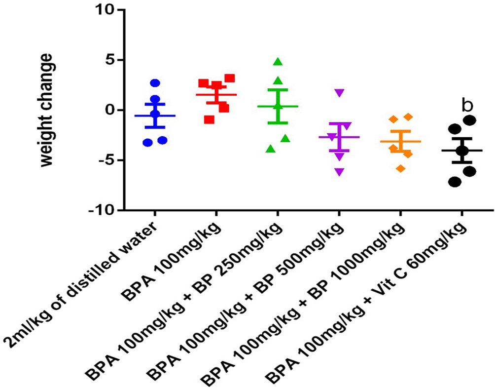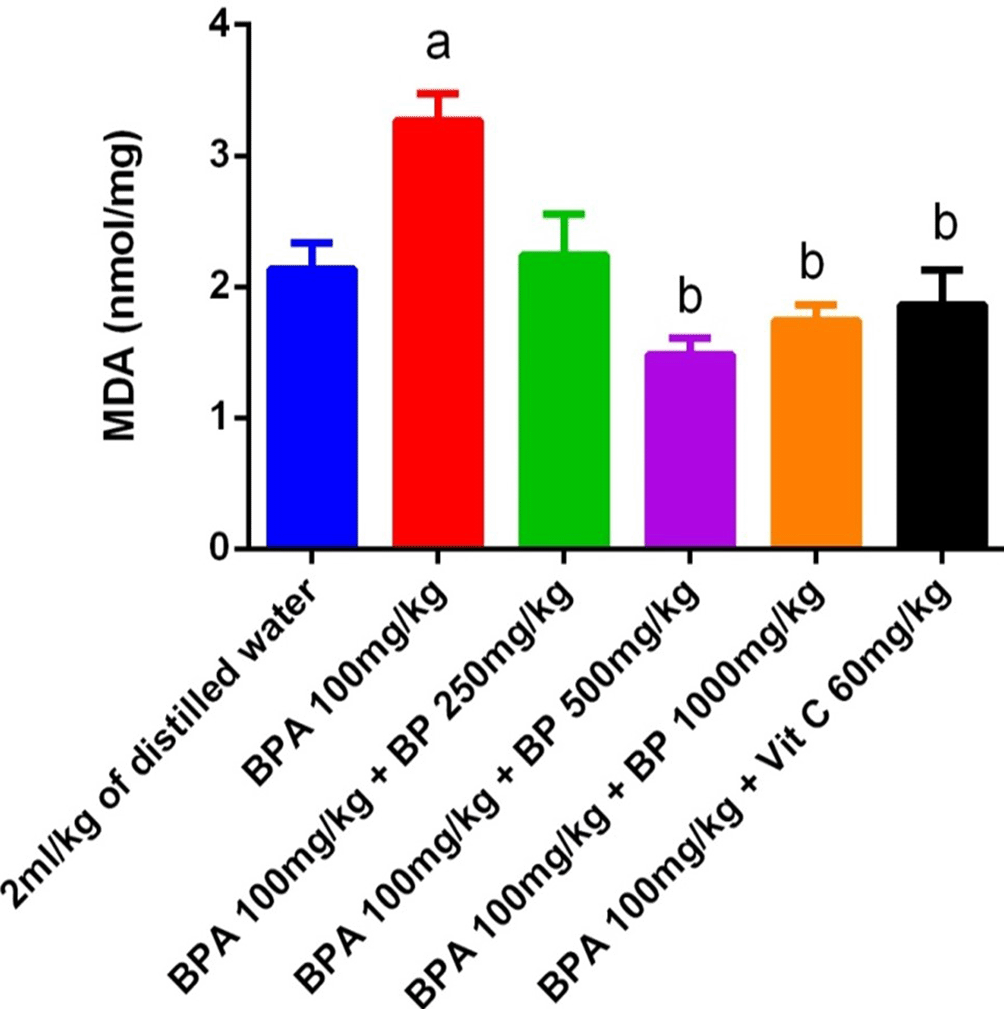 a denotes a significant difference from the control group; b denotes a significant difference from the Bisphenol A group (p < 0.05). BPA – Bisphenol A (n = 3).