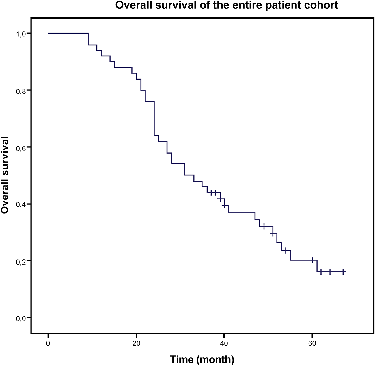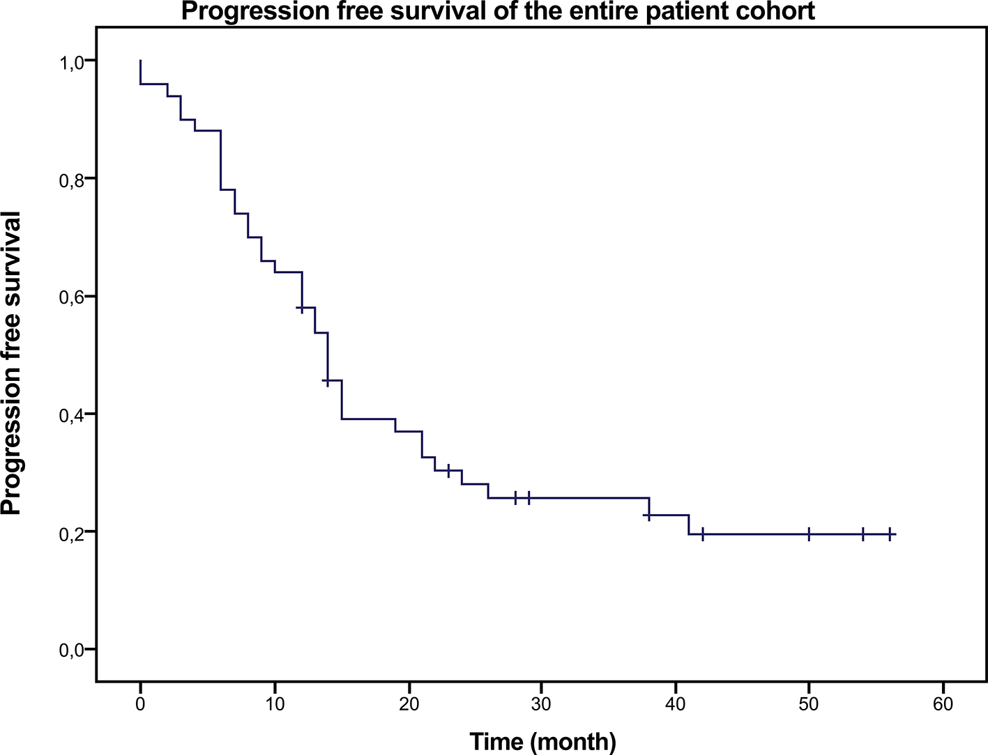 During a median follow-up of 39.9 months, we found that 52% of patients with disease progression, and 39 patients died. Median PFS was 14 months (95% CI: 7-24.5 months) and Median OS was 32 months (95% CI: 23.5-49.5 months). The 1-year PFS rate was 56% and the 3-year PFS rate was 18% (Figure 1). The 1-year OS rate was 92% and the 3-year OS rate was 44% (Figure 2).