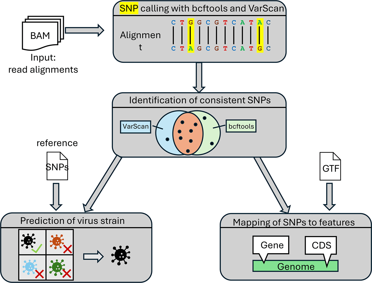 Figure 2 provides an overview of the steps performed for SNP calling. First, the variant callers bcftools16 and VarScan17 (after running ‘samtools mpileup’24) are applied independently to each input BAM file. Both tools provide the identified SNPs in the variant call format (VCF).25 Next, so-called consistent SNPs are determined that are identified by both bcftools and VarScan. If more than one replicate is available, SNPs are considered consistent if they are detected by both tools in all replicates. Consistent SNPs are then mapped to viral features, e.g., genes, coding sequences, or introns, given a gene annotation in GTF format for the viral genome.