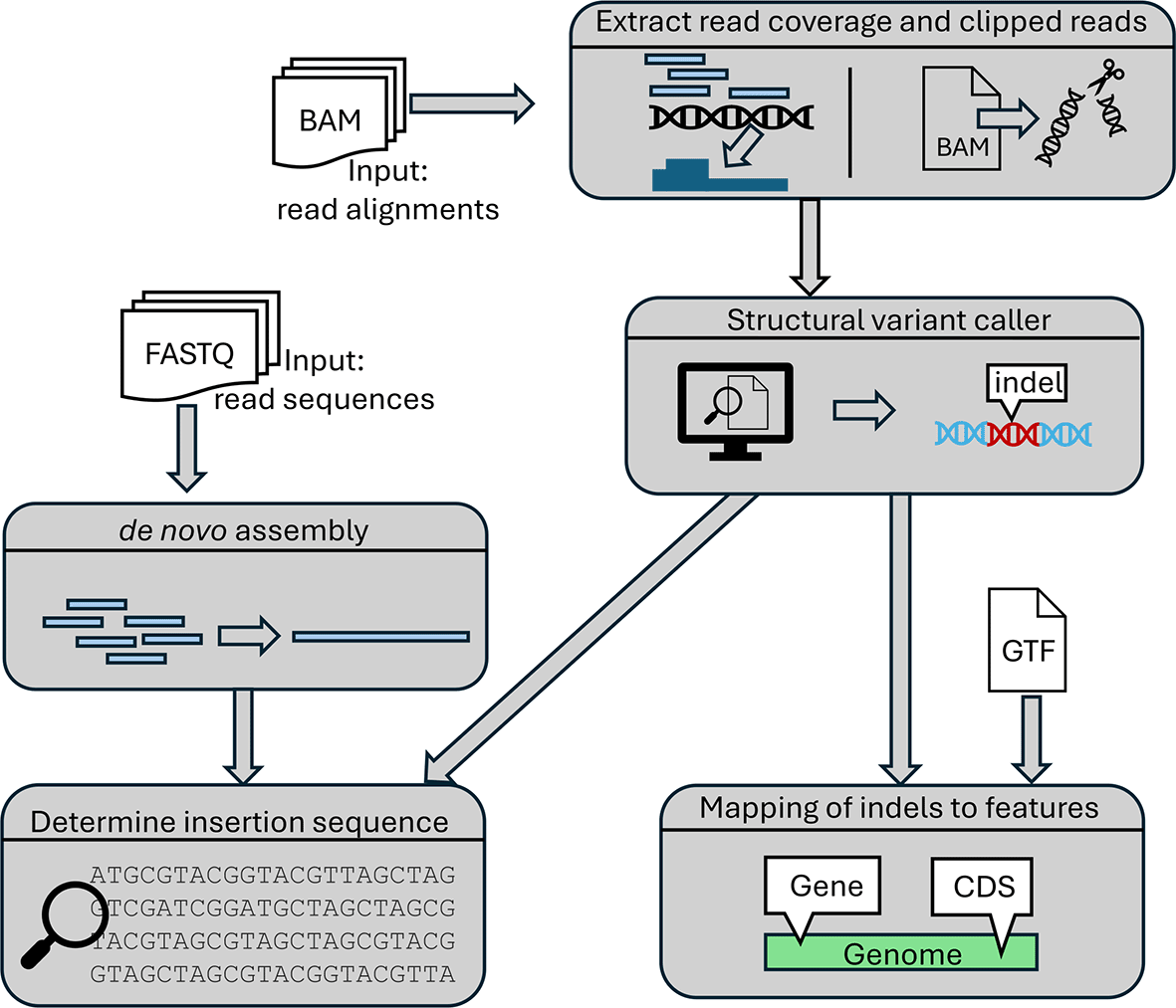 The variant caller pipeline is divided into two main parts, which are described in the following: (1) SNP calling and (optionally) strain identification and (2) indel detection and (optionally) identification of inserted sequences.