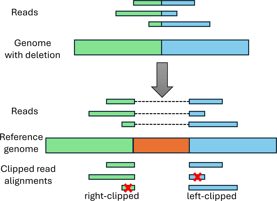Candidate deletions are subsequently verified using clipped read alignments. As depicted in Figure 4, reads crossing a deletion in the genome can only be aligned with gaps to the reference genome. If the alignment is performed using a non-splice-aware read aligner, such as BWA, this will result in clipped read alignments where only parts of the read are aligned to the genome. Notably, this often also occurs with splice-aware read aligners as the start and end nucleotides of the deletion generally do not match canonical splicing signals expected by many splice-aware read aligners.
