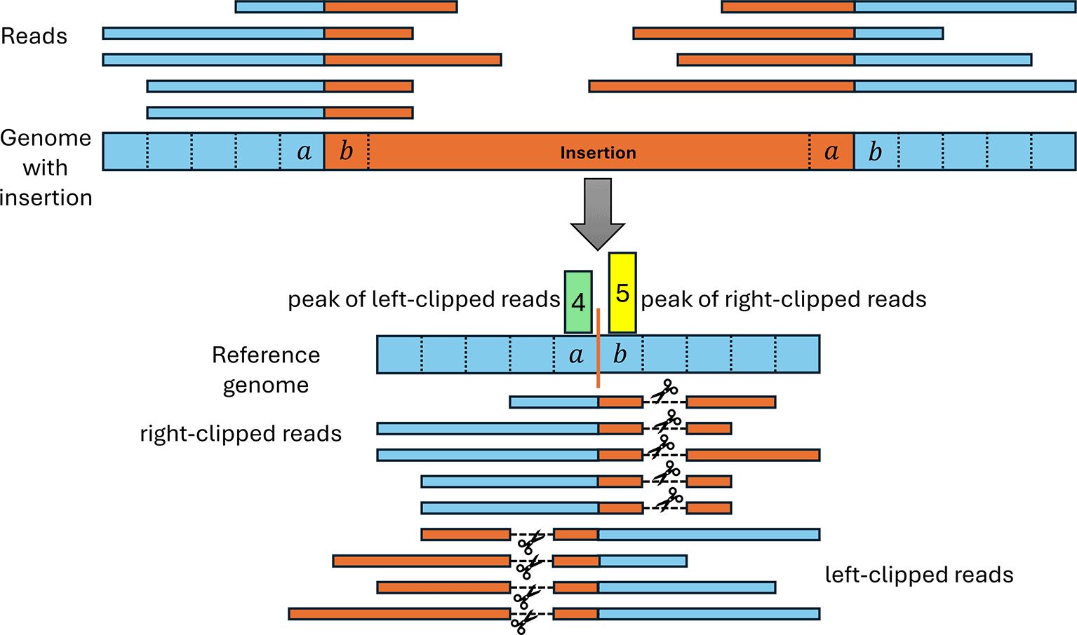 The top shows the mutated viral genome (blue) that contains an inserted sequence (orange) not present in the reference genome. Reads spanning the boundary of the insertion therefore contain parts of both the reference and insertion sequence. When aligned to the reference genome, the part of the reads containing the insertion sequence (orange) have to be clipped since they cannot be aligned to the reference genome. We observed that commonly the start and/or end of the insertion also matches the reference genome directly before and after the insertion site (in this example, 1 nt matches on each side). As a result, reads can be aligned beyond the insertion site, resulting in a distinctive insertion clipping pattern with a peak of left-clipped positions one or more positions left of a peak of right-clipped positions.