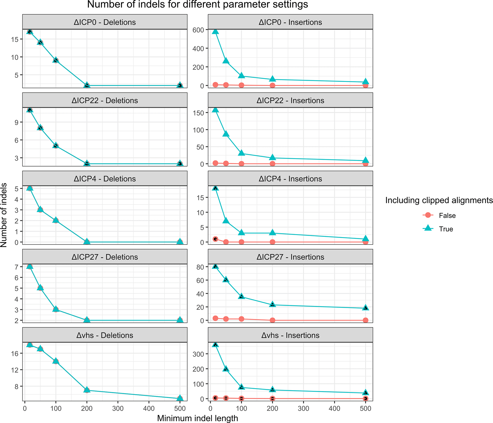 Figure 6 shows an evaluation of different thresholds on the indel length with and without inclusion of clipped contig alignments for insertion detection. This showed that a relatively small minimum indel length of 16 nt had to be used to identify all indels and clipped contig alignments had to be included. Higher minimum indel lengths excluded the 16 nt insertion in the ΔICP4 mutant, while the lacZ gene insertion in the ΔICP27 mutant would be missed without allowing clipped contig alignments. However, this parameter combination resulted in large numbers of predicted insertions for ΔICP0, ΔICP22, ΔICP27, and Δvhs mutants, making it difficult to distinguish the correct indels in these mutants.