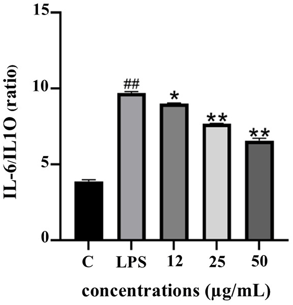 The IL-6/IL-10 ratio serves as a reliable biomarker for evaluating the balance between pro- and anti-inflammatory responses. As depicted in Figure 10, LPS stimulation significantly elevated the IL-6/IL-10 ratio, indicating a dominant pro-inflammatory state. Treatment with PF15 significantly reduced this ratio in a dose-dependent manner, suggesting a shift toward an anti-inflammatory phenotype and restoration of immune homeostasis.