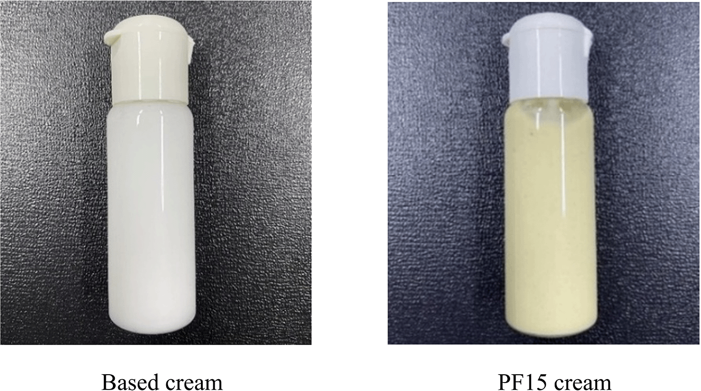 An anti-acne cream was formulated using the MIC concentration of PF15. The extract was incorporated into the cream formulation at a concentration of 0.8% w/w. The MIC of PF15 against Staphylococcus aureus was determined to be 7.8 mg/mL. To ensure effective antimicrobial performance in a topical dosage form, PF15 was incorporated at 0.8% w/w, corresponding to approximately 8 mg/g of formulation. The aqueous phase containing PF15 was heated to 70 °C, combined with the oil phase, and emulsified for 30 minutes. The cream was then cooled to 35–40 °C, mixed until homogeneous, and stored for further analysis. A topical cream was developed by incorporating the PF15 extract into a water-in-oil emulsion system. The detailed composition of the cream is presented in Table 2.