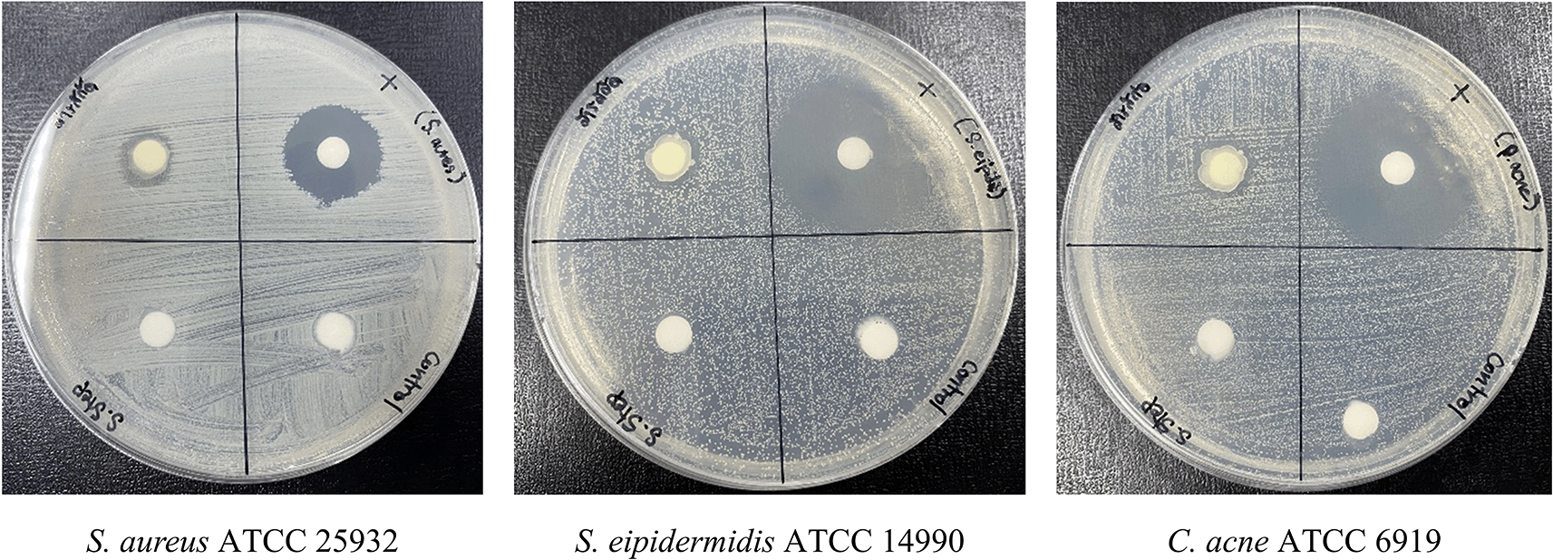 Using the disc diffusion method, antimicrobial activity was evaluated against S. aureus, S. epidermidis, and C. acnes. Cream without extract served as a negative control.