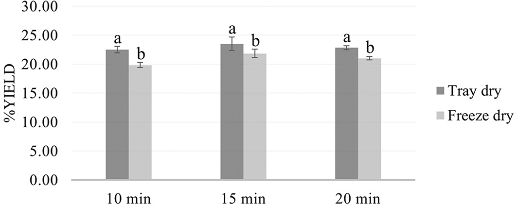 The filtered extracts were subjected to two drying techniques: freeze-drying (PF) and tray-drying (PT). The percentage yield (% yield) was calculated using the formula: