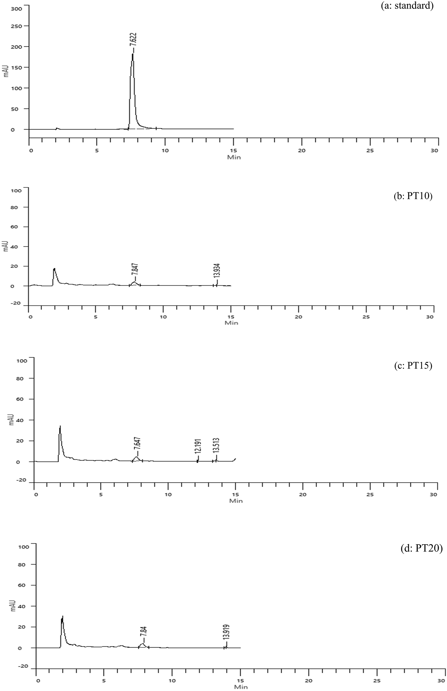 High-performance liquid chromatography (HPLC) analysis confirmed the presence of caffeic acid in all tray-dried extracts. The retention times observed for PT10, PT15, and PT20 were 7.847, 7.647, and 7.84 minutes, respectively, with corresponding concentrations of 1.04, 1.07, and 1.03 mg/g ( Figure 3b-d). These results reflect consistent caffeic acid retention across varying extraction times, with PT15 slightly outperforming others. However, the overall concentration remained modest, suggesting that tray drying may limit phenolic preservation.