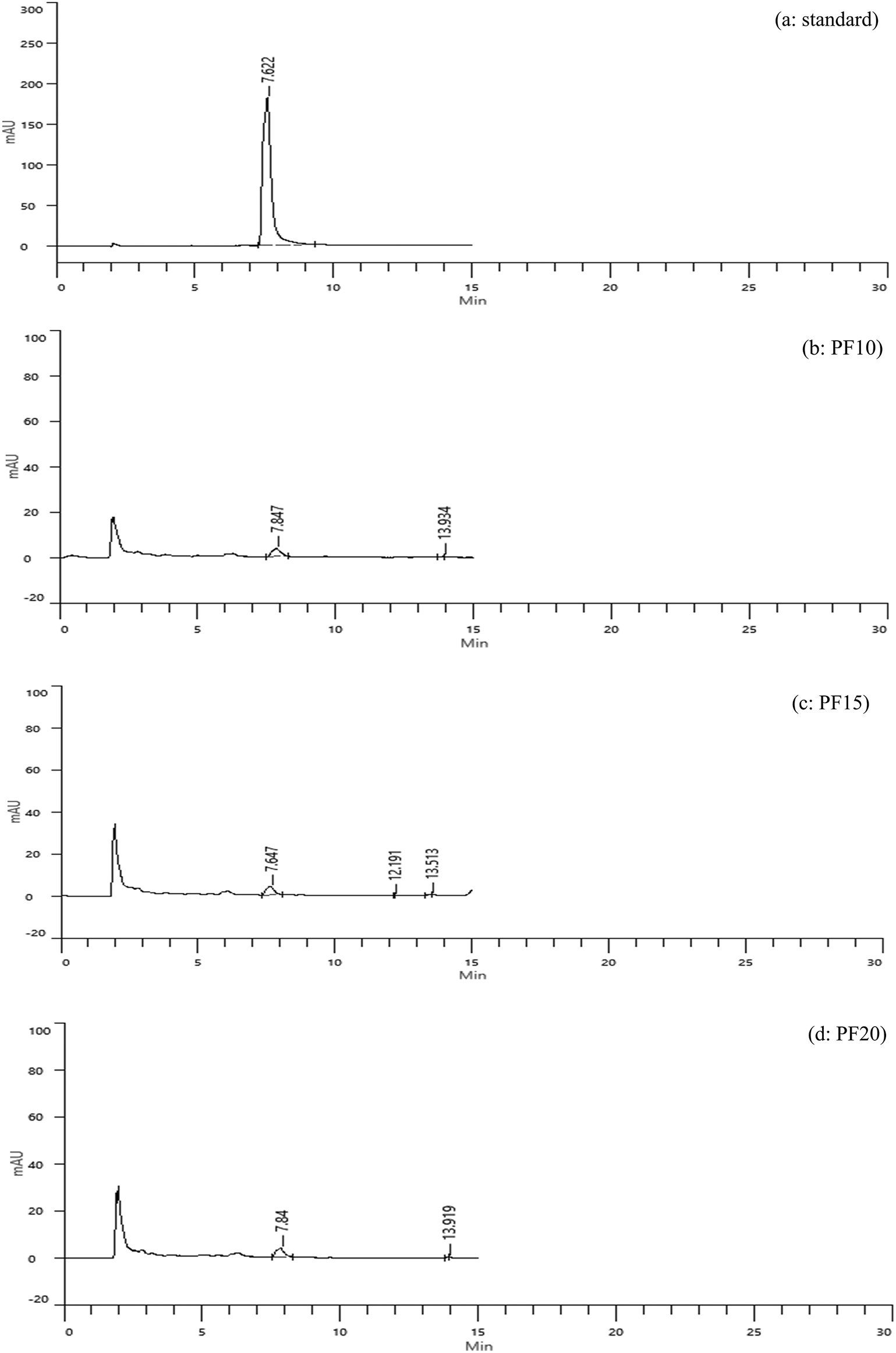 Caffeic acid content in freeze-dried extracts was significantly higher: 3.15, 3.33, and 3.29 mg/g for PF10, PF15, and PF20, respectively ( Figure 4b-d). Retention times were consistent with the standard, confirming accurate identification. PF15 exhibited the highest caffeic acid content, indicating that 15 minutes of MAE under freeze-drying conditions is high phenolic preservation. The increased levels of caffeic acid in PF samples may be attributed to the lower thermal stress during drying, which minimizes degradation of sensitive compounds.21