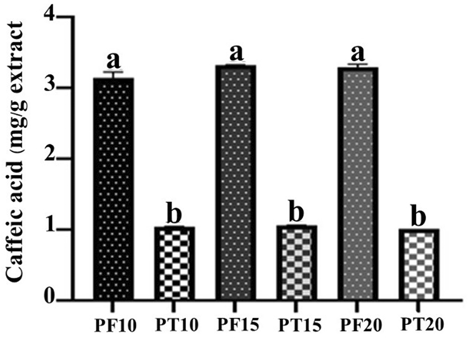 Extracts from MAE (PT10, PT15, PT20, PF10, PF15, PF20) were analyzed for caffeic acid content. It was the most abundant phenolic identified in preliminary HPLC profiling. The standard of caffeic acid was used to construct the calibration curve. Each 0.05 g sample was dissolved in ethanol and diluted to 50 mL. Solutions were filtered through a 0.45 μm membrane filter and placed into 2 mL vials. High-performance liquid chromatography (HPLC) was used for quantification. Conditions are listed in Table 1.