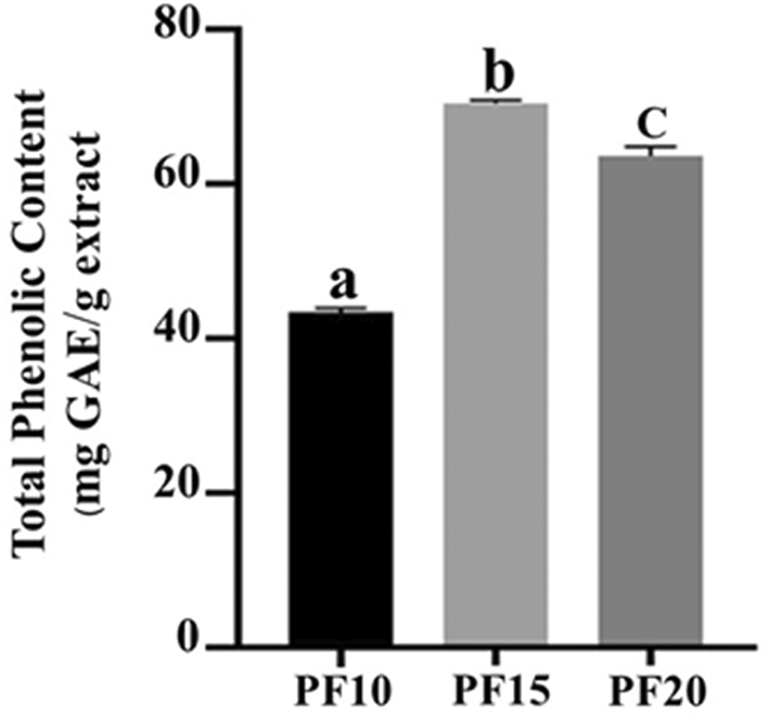 TPC was measured using the Folin–Ciocalteu method on PF10, PF15, and PF20 samples. Extracts (200 μL) were mixed with 1,000 μL of Folin–Ciocalteu reagent and 800 μL of 7.5% sodium carbonate. After incubation at room temperature for 60 minutes, absorbance was measured at 765 nm. A gallic acid standard curve (16–250 mg/L) was used to calculate phenolic content, reported as mg gallic acid equivalents per gram (mg GAE/g extract).12,13