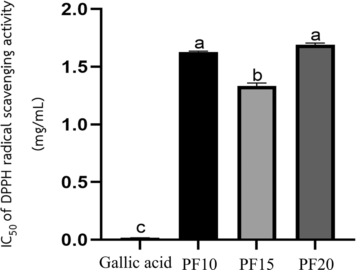 The antioxidant activity of PF10, PF15, and PF20 was assessed using the DPPH (2,2-diphenyl-1-picrylhydrazyl) radical scavenging method with some modification.14 Various concentrations of extract (0.125–4 mg/mL) and gallic acid (0.01-0.05 mg/mL) were tested. After mixing 50 μL of each sample with 100 μL DPPH (2,000 μM), the reaction was incubated in darkness for 30 minutes. Absorbance was read at 517 nm.