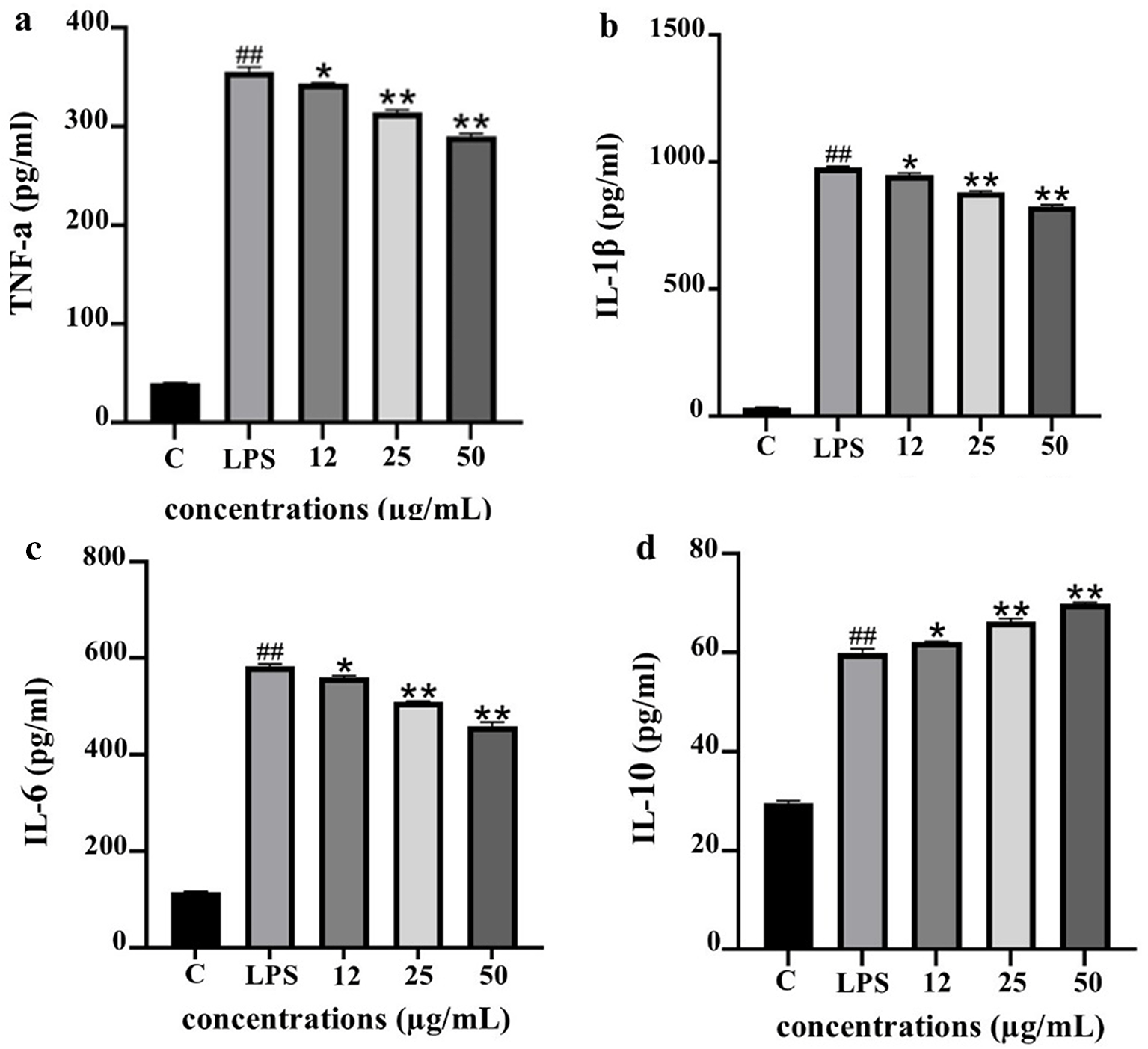 ELISA was used to quantify TNF-α (a), IL-1β (b), IL-6 (c), and IL-10 (d). Data are expressed as mean ± SD (n = 3). ##p < 0.001 vs. control (C); *p < 0.05, **p < 0.001 vs. LPS group.