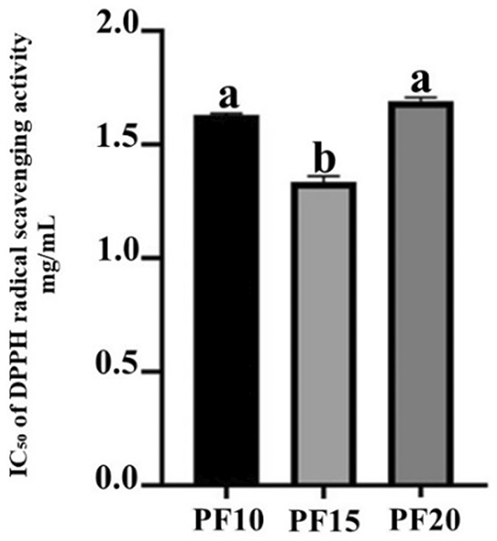 The antioxidant activity of PF10, PF15, and PF20 was assessed using the DPPH (2,2-diphenyl-1-picrylhydrazyl) radical scavenging method.14 Various concentrations of extract (0.125–4 mg/mL) and L-ascorbic acid (12–400 μg/mL) were tested. After mixing 50 μL of each sample with 100 μL DPPH (2,000 μM), the reaction was incubated in darkness for 30 minutes. Absorbance was read at 517 nm.
