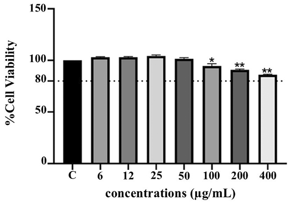 The cytotoxicity of PF15 was assessed in human THP-1 monocytes using the PrestoBlue® viability assay. As illustrated in Figure 8, PF15 at concentrations ranging from 6 to 50 μg/mL did not significantly reduce cell viability compared to the untreated control group. Cell viability remained above 80% at all tested concentrations, indicating that PF15 was non-cytotoxic under the experimental conditions. A statistically significant increase in viability was observed at certain concentrations (p < 0.01 and p < 0.001), suggesting a potential dose-dependent proliferative or protective effect on THP-1 cells.