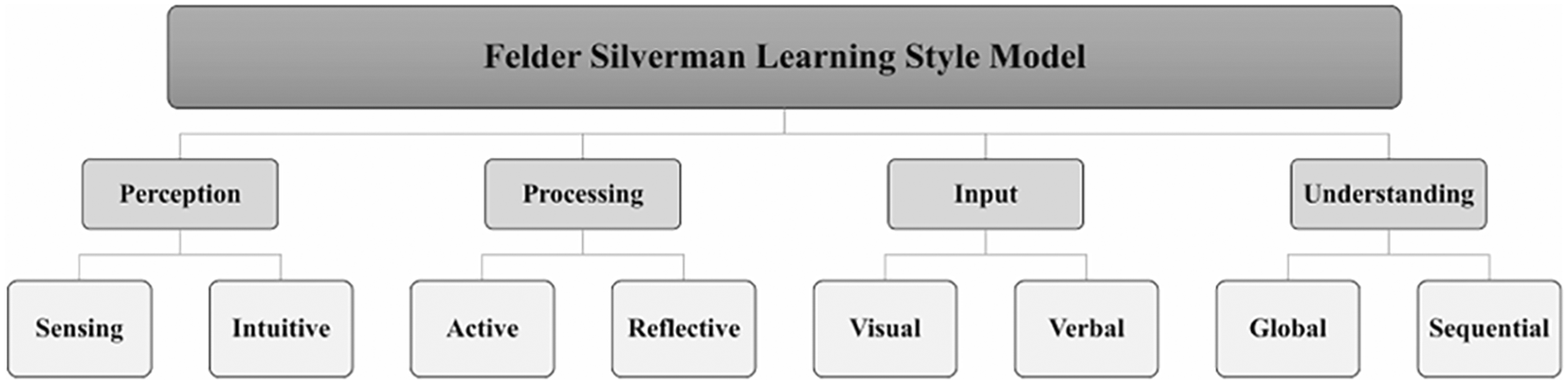 In summary, incorporating learning styles into e-learning and adaptive systems can significantly improve the personalisation and effectiveness of these platforms. As shown in Figure 1, the Felder-Silverman Learning Style Model (Rasheed & Wahid, 2021) provides a structured approach to categorising learning preferences. However, limitations in adapting Felder-Silverman Learning Style Model to mobile environments must be addressed to maximise effectiveness in adaptive learning systems. This study focuses on leveraging collaborative filtering and AI-driven solutions, which offers greater flexibility for integration. Additionally, advances in machine learning also offer promising ways to better tailor education to individual needs, although more work is needed to fully meet the diverse requirements of all students. This highlights the importance of integrating collaborative filtering and machine learning into adaptive systems to improve student engagement and academic performance, as proposed in this study.