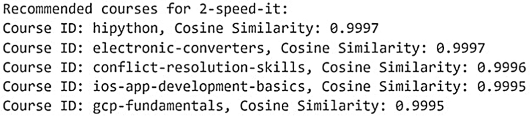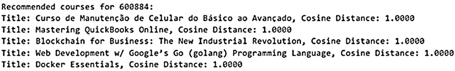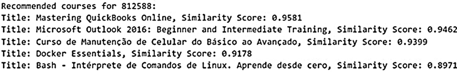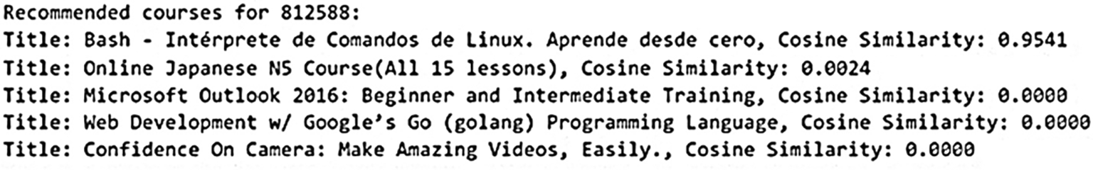 Neural Collaborative Filtering (NCF) is a deep learning-based approach to collaborative filtering that uses neural networks to model user-item interactions (Jena et al., 2023). Unlike traditional methods like KNN or SVD, which rely on linear relationships, NCF captures complex, non-linear interactions between users and items. In this study, the NCF model was implemented using Python with TensorFlow and Keras libraries. This approach is better suited for large and complex datasets. Figure 12 and Figure 13 below show the recommended course results in NCF model for dataset 1 and dataset 2.
