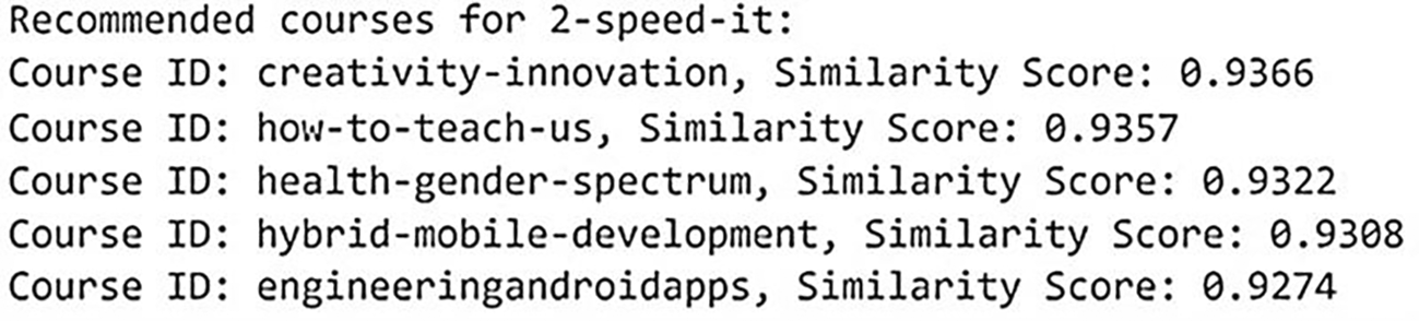Besides that, the Singular Value Decomposition (SVD) model was used to recommend courses based on user preferences (Jena et al., 2023). SVD is a technique that breaks down the user-item interaction matrix into smaller parts, helping to identify hidden factors influencing user choices. The SVD model was implemented using the Surprise library in Python with default settings. This allows the model to predict missing ratings or interactions, which is useful for recommending courses that users may be interested in. Figure 10 and Figure 11 below show the recommended course results in the SVD model for dataset 1 and dataset 2.