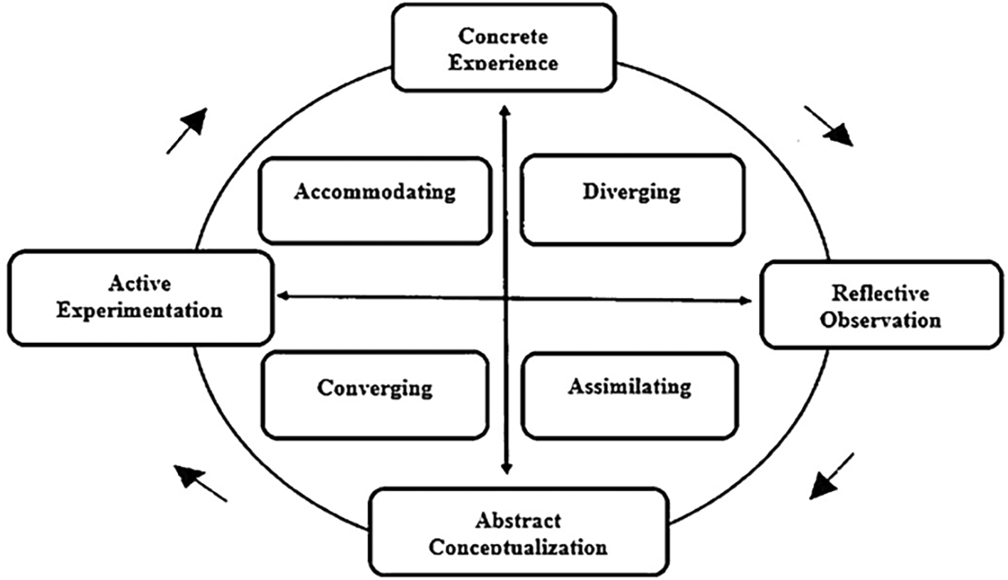 The four-stage learning cycle and associated learning styles proposed by Kolb.