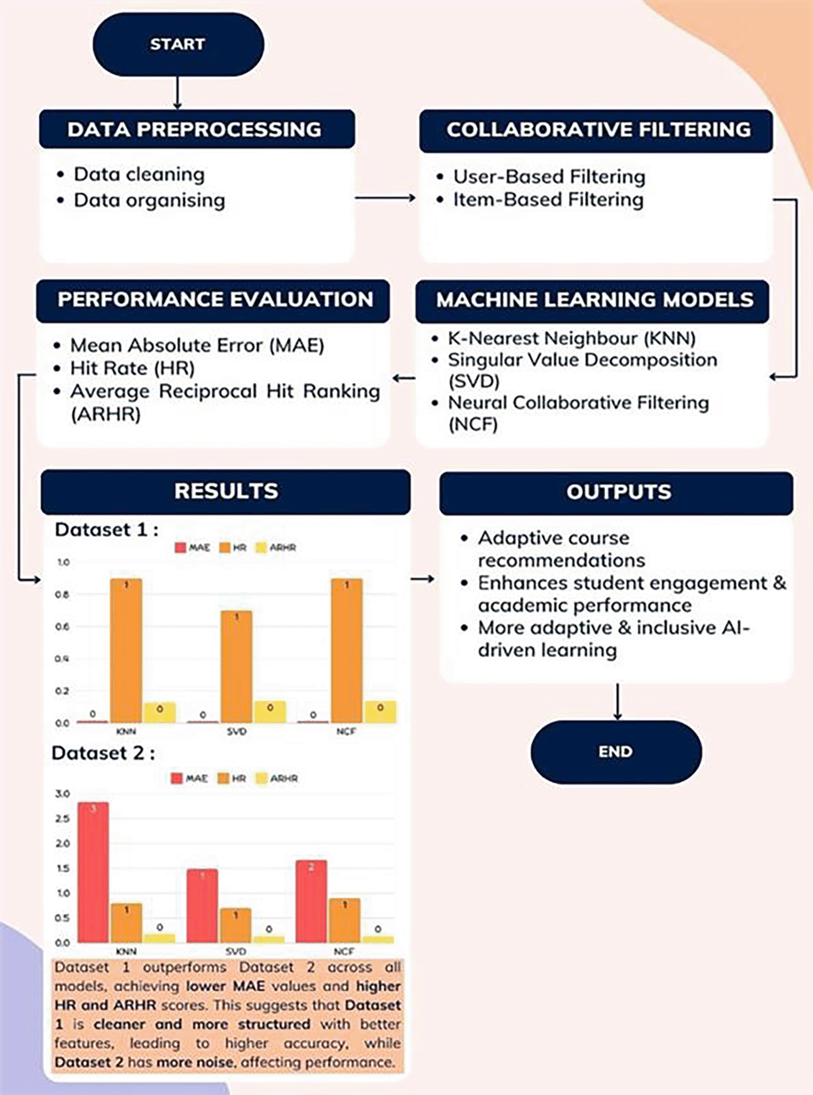 This study employs the K-Nearest Neighbours (KNN) model, Singular Value Decomposition (SVD) model, and Neural Collaborative Filtering (NCF) model to implement recommendation and collaborative filtering mechanisms for e-learning course recommendations. Figure 4 presents the Proposed Framework, illustrating the integration of collaborative filtering and machine learning techniques within the AI-driven LMS. This framework outlines the process flow from data preprocessing to performance evaluation, enhancing recommendation accuracy and supporting an adaptive learning experience.