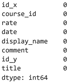 After loading the dataset into Jupiter Notebook, then merge the two CSV files into one to combine relevant information from both sources. To ensure data integrity, duplicate entries were removed, maintaining a clean and unique dataset. Next, a comprehensive check for missing values was conducted and the drop function was employed to eliminate rows containing “Nan” values. Additionally, text preprocessing was performed on the “Review” column of both datasets to enhance the quality of the textual data. A custom function was applied to clean the reviews by removing special characters, extra whitespace, and converting the text to lowercase, ensuring consistency in the dataset. This cleaning step was essential for optimising the performance of subsequent text-based analysis and modeling. The sparsity of the resulting matrix was calculated, giving an indication of the proportion of missing values in the dataset. To improve computational efficiency, the matrix was converted into the Compressed Sparse Row (CSR) format, which is optimised for storing and processing sparse matrices. Finally, the dataset was split into training and testing subsets. This preprocessing stage ensured that the dataset was clean, consistent, and ready for the next steps of modeling and evaluation. Figure 5 shows the results of the missing values check for dataset 1. Figure 6 shows the results of the missing values check for dataset 2, while Figure 7 presents the results after removing the missing values from dataset 2.