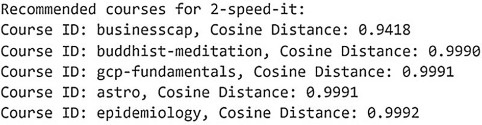 After the data pre-processing step, this study involved implementing a K-Nearest Neighbours (KNN) algorithm to recommend courses based on user preferences (Jena et al., 2023). The KNN model was chosen due to simplicity and effectiveness in collaborative filtering tasks. The KNN model was implemented using the scikit-learn library, with cosine similarity as the distance metric, commonly used in recommendation systems for measuring similarity between non-negative vectors. The model was trained using the sparse matrix of course-user interactions. A recommendation function was defined to retrieve the most similar courses based on similarity scores. Finally, the recommendations are presented along with the cosine distance, where a lower distance signifies higher similarity. The recommendations provide valuable insights into the course similarity patterns within the dataset. Figure 8 and Figure 9 below show the recommended course results in KNN model for dataset 1 and dataset 2.