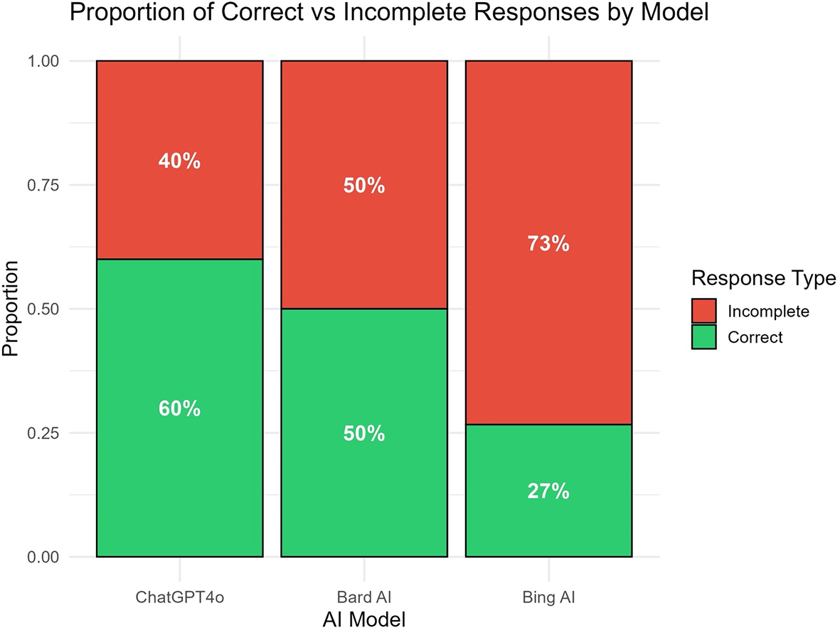 All statistical analyses were conducted using R version 4.4.0 with relevant packages including dplyr, ggplot2, irr, DescTools, and reshape2. Initial analysis quantified the frequency and percentage of correct versus incomplete responses for each model. Numbers and percentages were used to quantify the data.