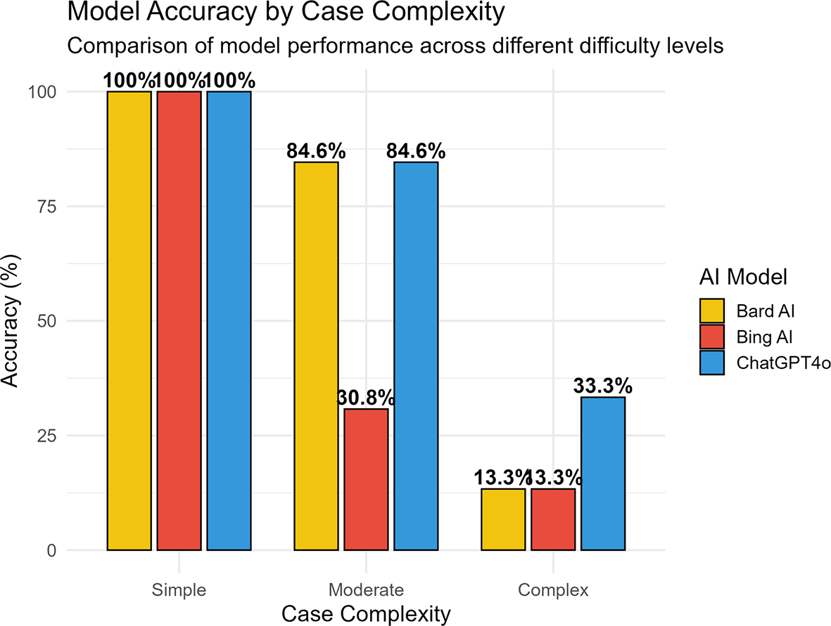 To explore performance sensitivity across varying levels of question difficulty, the dataset was stratified into three cases: Simple (three models correct), Moderate (two models correct), and Complex (zero or one models correct). Accuracy rates across these categories are visualized in Figure 3. In simple cases, all models performed at 100% accuracy. For Moderate cases, ChatGPT-4o continued to perform strongly (86.4% accuracy), while Bing AI dropped to 30.8%. The trend held in Complex cases, where ChatGPT-4o maintained 33.3% accuracy, outperforming Bard AI (13.3%) and Bing AI (13.3%). These findings suggest that ChatGPT-4o is more resilient to complexity, while the other models degrade more sharply in performance under challenging conditions ( Figure 3).