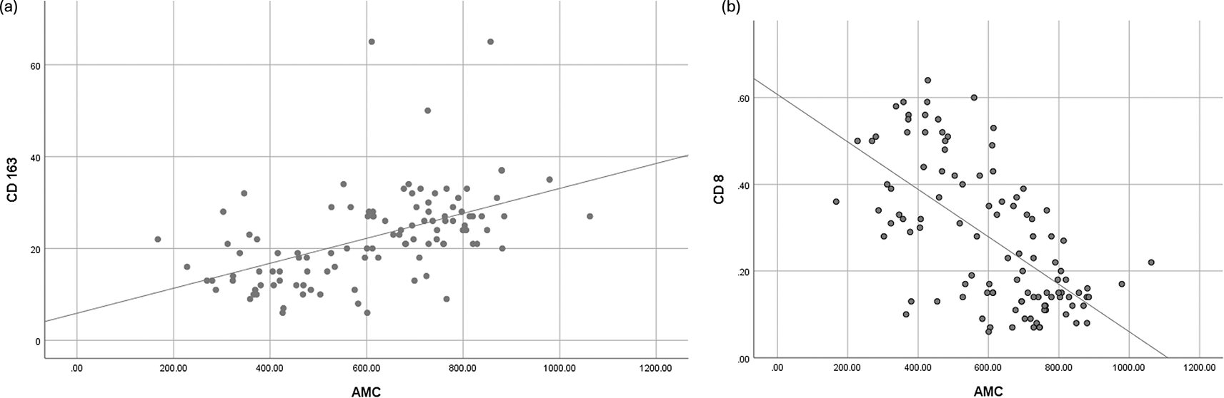 A moderate positive correlation was observed between AMC and CD163 expression, consistent with prior findings by Li et al.19,25 In contrast, a negative correlation between AMC and CD8 expression was identified, which diverges from findings in other malignancies, such as breast cancer, where a weak positive correlation was reported.19,26 This highlights the context-dependent role of monocytes and lymphocytes in different tumor microenvironments.