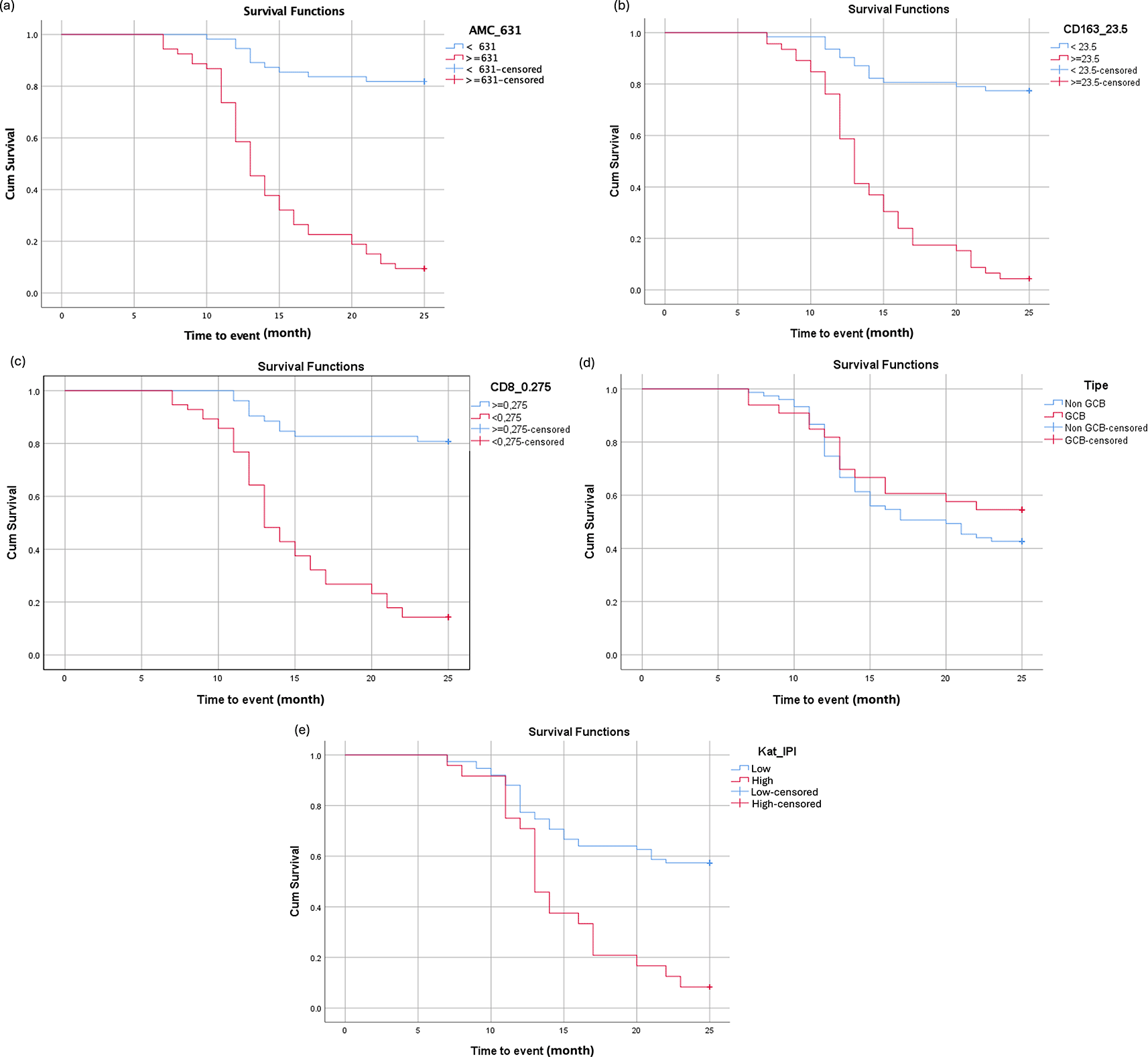 We identified optimal cutoff values for AMC (631/mm3), CD163 (23/HPF), and CD8 (27.5%/HPF), which were predictive of EFS. The median survival time of 13 months in our cohort supports findings from earlier studies showing worse outcomes in patients with AMC > 630/mm3.11,19 Similarly, the prognostic significance of high CD163 expression is consistent with the study by Li et al., which identified a cutoff of 19/HPF for CD163-positive TAMs and associated high expression with poorer progression-free and overall survival.19–21