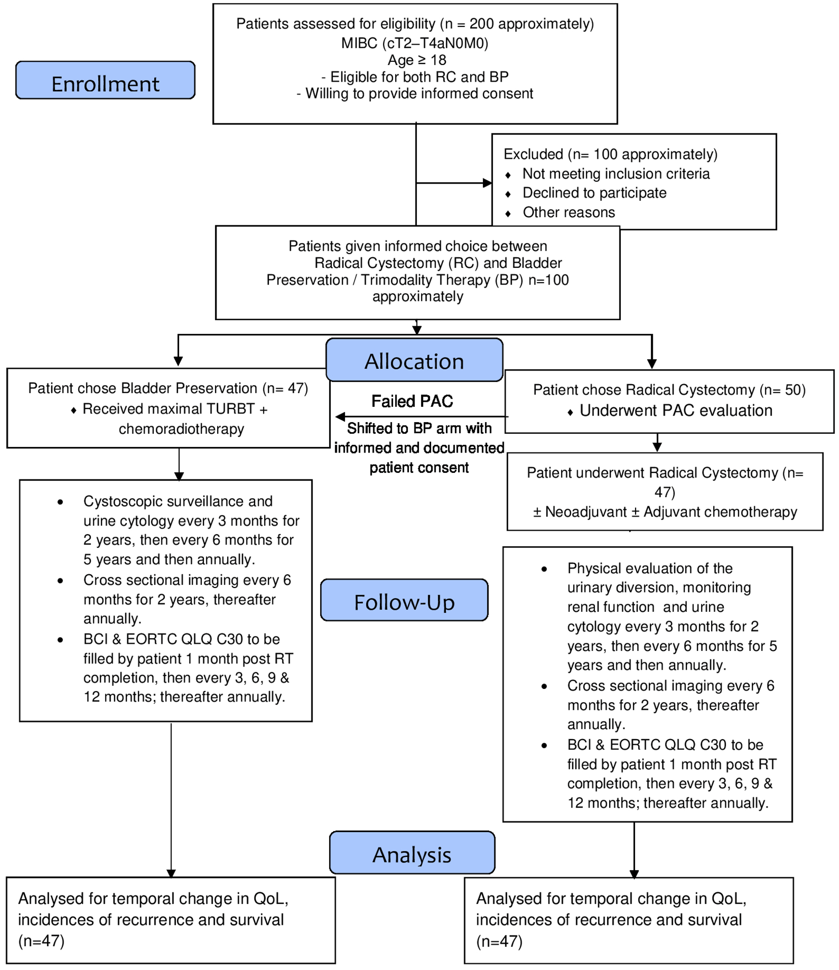The QUEST study will generate institution-specific data on the comparative effectiveness of bladder preservation and RC for MIBC, focusing on QoL and survival. By addressing the unique needs of Indian patients, it aims to support shared decision-making and potentially influence clinical practice guidelines in similar settings. These findings may pave the way for future research to refine treatment protocols and optimize patient-centered outcomes in bladder cancer care.