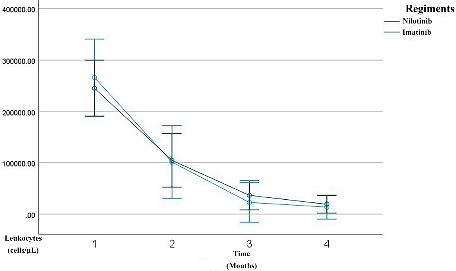 Both imatinib and nilotinib regiments showed similar trends of improvement across major hematological indices, including decreased leukocyte and platelet count, increased hemoglobin, and hematocrit, over the course of three months. Using Generalized Linear Model Repeated Measures (GLM-RM) analysis, a significant main effect of time was observed for these parameters (p < 0.001), indicating that hematological values improved with continued therapy. However, the interaction between time and drug regiment did not yield statistically significant differences for most parameters (p > 0.05), suggesting that both imatinib and nilotinib had comparable efficacy in modifying hematological profiles within the longer observed period ( Table 2). Although slight variations in response dynamics were noted, such as for example, nilotinib showed a steeper decline in leukocyte count and a more pronounced increase in hemoglobin, these differences were not statistically significant. Likewise, changes in MCV, MCH, neutrophils, lymphocytes, monocytes, eosinophils, and basophils were observed over time, but again without meaningful distinction between regiments in their interaction with time.