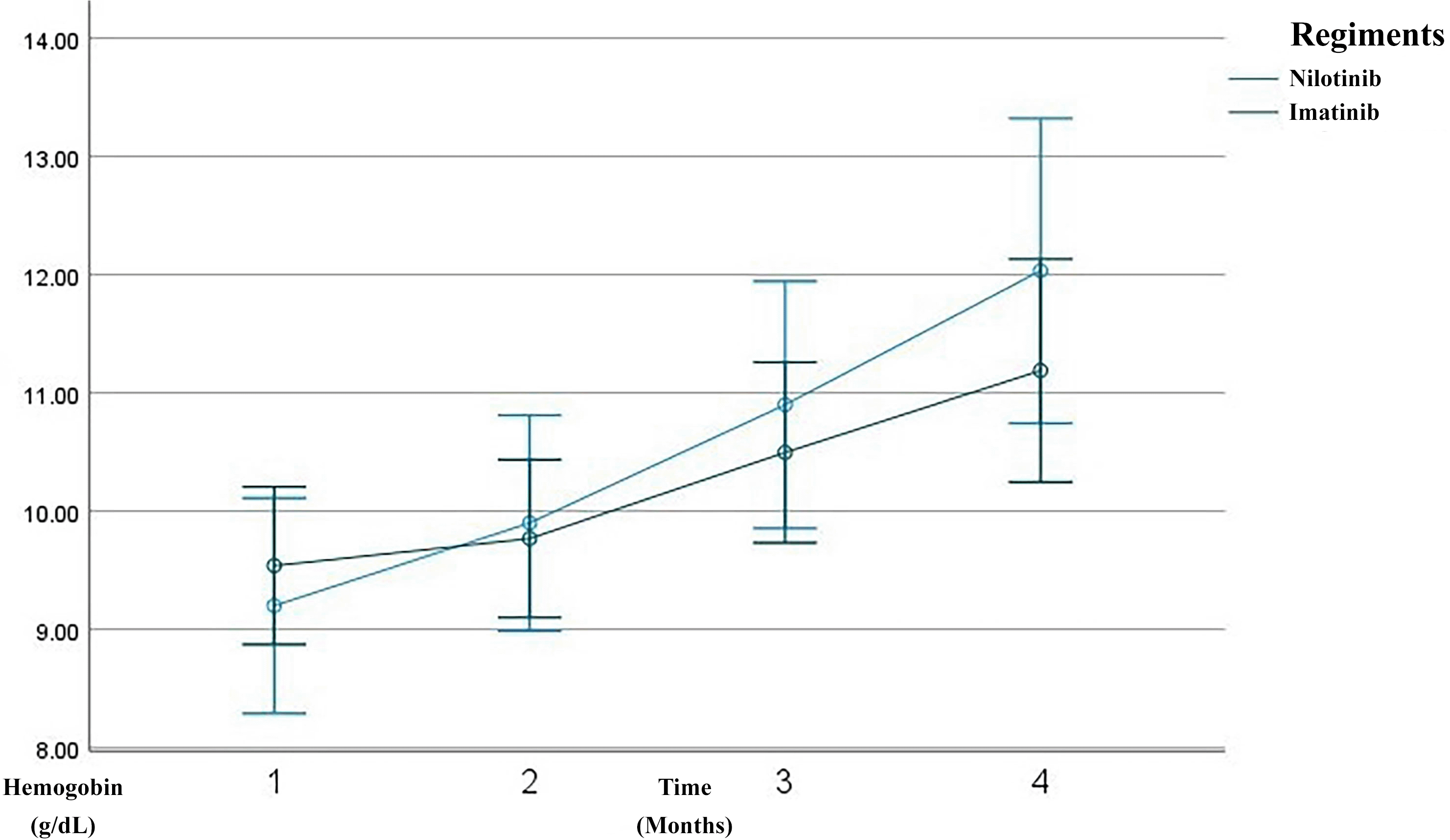 Table 2 refers to the changes in the hematological parametes, where improvement in leukocyte and platelet counts over 3 months therapy, and increase in hemoglobin and hematocrit wither in imatinib or nilotinib group. The p-value for time is p < 0.05 while time and regiment p > 0.05.