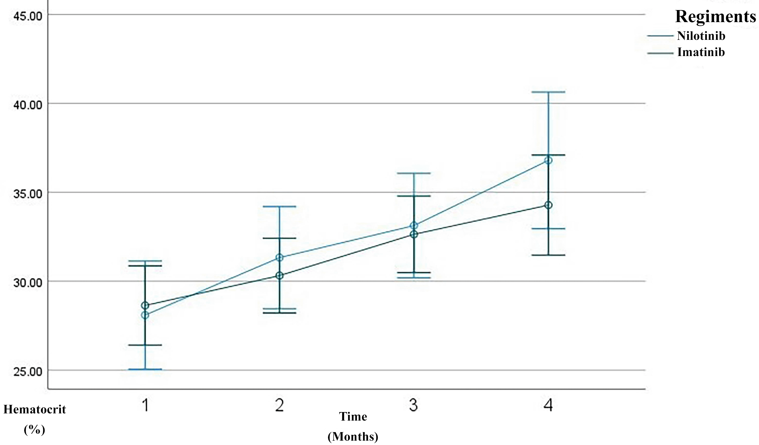 Both TKI regiments significantly improved hematologic parameters (p < 0.001), with reductions in leukocyte counts and increases in hemoglobin and hematocrit. No significant interaction was found between time and treatment type (p > 0.05), indicating comparable efficacy. Patients receiving nilotinib showed a higher rate of complete response (60%) than those on imatinib (32.1%), though not statistically significant (p = 0.078). Body weight and BMI significantly influenced hematologic improvements (p < 0.05), while age did not.
