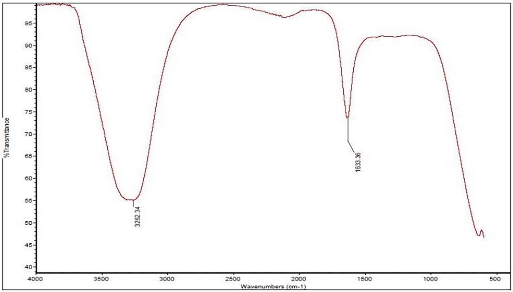 In the case of the water extract, two primary IR peaks were identified at 1633.36 cm−1 and 3262.34 cm−1 [Figure 1]. The peak at 1633.36 cm−1 is correlated with C=C stretching or bending vibrations, indicating the presence of carbonyl compounds or conjugated systems, whereas the peak at 3262.34 cm−1 indicates hydroxyl groups (-OH), proposing a rich content of phenolic compounds and other alcohols (Coates, 2006).
