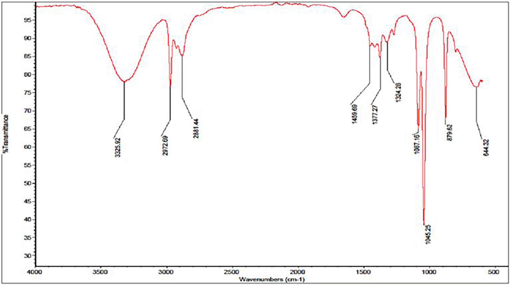 For the ethanol extracts, a broader range of IR peaks was observed, specifically at 644.32 cm−1, 879.62 cm−1, 1045.25 cm−1, 1087.16 cm−1, 1324.28 cm−1, 1377.27 cm−1, 1459.69 cm−1, 2881.44 cm−1, 2972.69 cm−1, and 3325.92 cm−1 [Figure 2]. These peaks provide details about various functional groups present in the ethanol extracts. Notably, the peaks around 1045.25 cm−1 and 1087.16 cm−1 are characteristic of C–O stretching vibrations, often associated with sugar derivatives and alcohols. Additionally, the peaks at 2881.44 cm−1 and 2972.69 cm−1 relate to C–H stretching, suggesting the presence of aliphatic hydrocarbons, while the peak at 3325.92 cm−1 indicates the presence of hydroxyl groups (Coates, 2006).