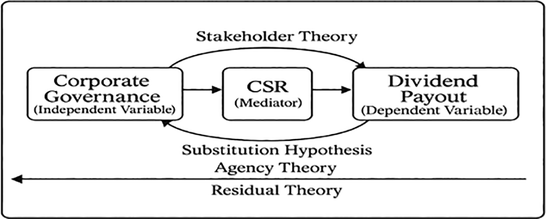 As the function of CSR is to make firms accountable to their stakeholders, firms committed to CSR practices can identify and assess the demands of different stakeholders. These CSR commitments facilitate a strong link between a firm and its stakeholders by considering their needs and demands. According to Ref. 90, CG and CSR are interdependent, and CSR as a firm’s obligation to society can be regarded as an external mechanism of corporate governance. The main argument in this paper is that CG is likely to influence the corporate social responsibility (negatively/positively), which in turn influences dividend payments. Our expectation of CSR’s mediating role in the link between CG and dividend policy is based on two arguments. First, in the context of stakeholder theory, firms with effective CG invest more in CSR to ensure the protection of all stakeholders beyond shareholders.91,92 Further, the earnings channel predicts that firms with stronger CSR involvement are expected to pay higher dividends.83,93 Based on these theories, it is argued that better CG can result in high CSR involvement, which in turn leads to high dividend payments through the increased reputation and earnings of the firm. Therefore, CSR is expected to facilitate a link between CG and dividend policies.