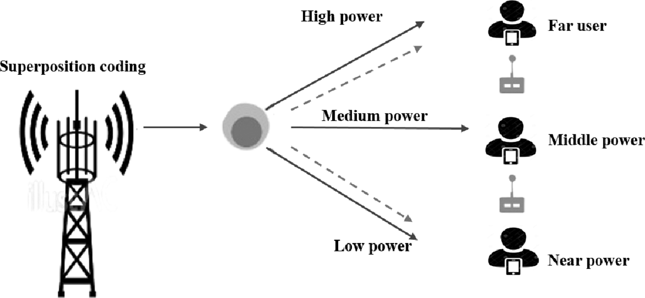 NOMA is characterized by the user ordering a concept that plays a pivotal role in effective decoding. Normally, the channel conditions of users are ranked, and the farthest or weakest user is ranked first and the nearest or strongest user last (Mohsan et al., 2023). This sequence determines the power distribution as well as the sequence of decoding. As an example, a two-user NOMA system will assign more power to the weaker user and directly decode its signal at the expense of the stronger user signal (Abbasi & Yanikomeroglu, 2022). The more powerful user implements SIC by decoding the low-power signal of the weaker user, deducting it from the composite signal, and then decoding its own, lower-power signal, as illustrated in Figure 1. This power-domain multiplexing and user ordering combination gives NOMA the ability to provide spectral efficiency, user connectivity, and system throughputs higher than orthogonal schemes (Khan & Singh, 2024). In a two-user downlink NOMA system, the base station (BS) employs power-domain superposition coding to simultaneously serve multiple users within the same time-frequency resource. The transmitted signal is expressed as (Tola et al., 2024):
